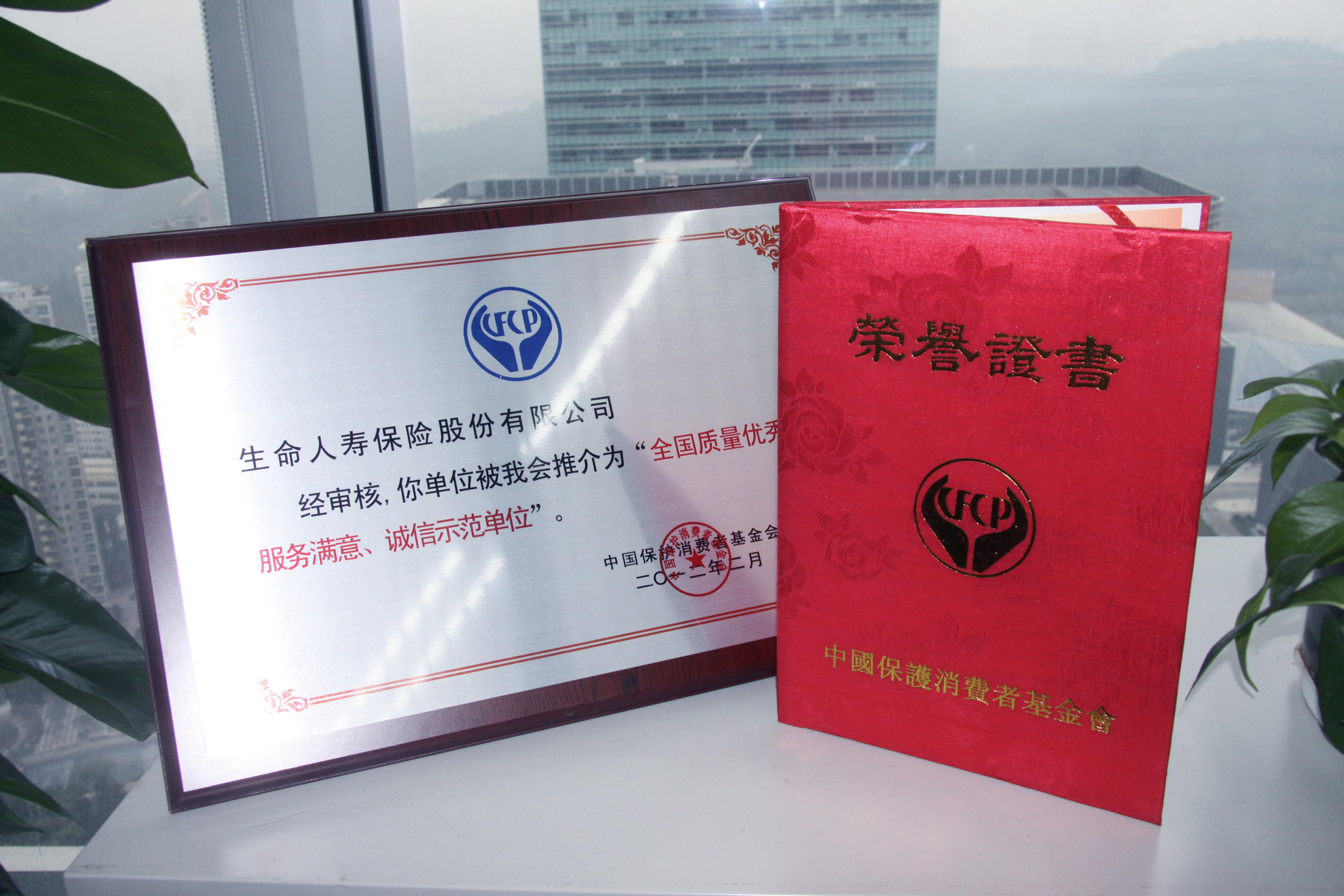 生命人壽獲“全國質(zhì)量優(yōu)秀、服務(wù)滿意、誠信示范單位”獎牌、證書