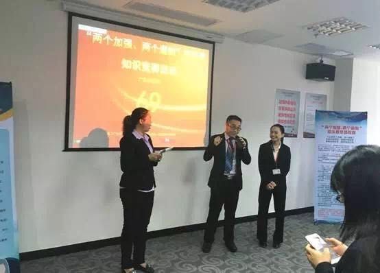 廣東分公司緊緊圍繞“六個(gè)一”,全力做好“三個(gè)100%”,即組織一次“兩兩”回頭看知識的深入學(xué)習(xí)、進(jìn)行一次合規(guī)意識和規(guī)矩意識的思想教育、開發(fā)一套完整學(xué)習(xí)的工具、堅(jiān)持一次持續(xù)時(shí)間最長的抽查、完成一次全員考試、舉辦一場監(jiān)管授課,確保學(xué)習(xí)覆蓋率100%,考試覆蓋率100%,滿分率100%。分公司每周內(nèi)勤早會專門設(shè)置“兩兩”知識問答環(huán)節(jié),由總經(jīng)理室或“兩兩”知識活動組織突出的部門長隨機(jī)出題,每周一隨機(jī)抽取三名伙伴進(jìn)行現(xiàn)場知識問答通關(guān),每人三題,通關(guān)失敗者接受小懲罰并在下周繼續(xù)上臺答題,直至通關(guān)成功。