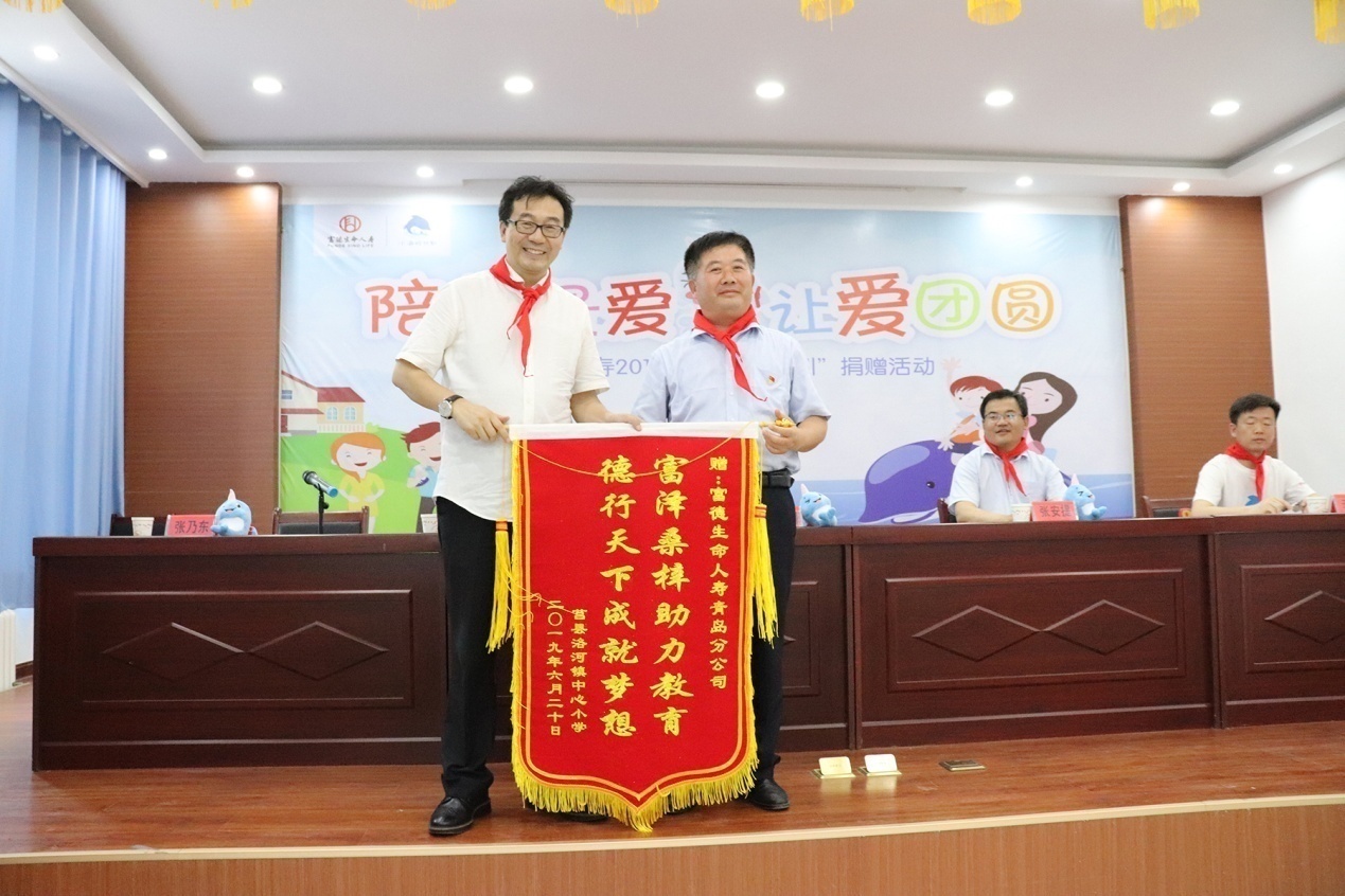 6月20日,青島分公司總經(jīng)理陳長(zhǎng)國(guó)帶領(lǐng)小海豚志愿者們來(lái)到山東莒縣洛河鎮(zhèn)中心小學(xué),向200名貧困學(xué)生捐助了總保額達(dá)1200萬(wàn)元的“小海豚計(jì)劃”專(zhuān)屬保障以及“小海豚溫暖包”等愛(ài)心物資,洛河鎮(zhèn)中心小學(xué)送上了感謝錦旗。