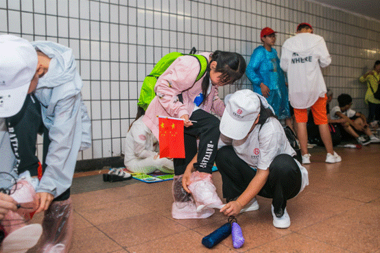 好事多磨,三點(diǎn)多離開酒店的時(shí)候卻刮起了狂風(fēng),大雨隨之而下,但這并不能澆滅孩子們的熱情。到達(dá)天安門后,孩子們?cè)诟浇牡叵峦ǖ览锎┥嫌暌滦?,之后安靜有序地排隊(duì)來到了天安門廣場(chǎng)上,等待升旗。等待的時(shí)間是漫長(zhǎng)的,但是沒有孩子不耐煩或是想睡覺,我想支撐著他們的,定是那顆激動(dòng)又崇敬的心。