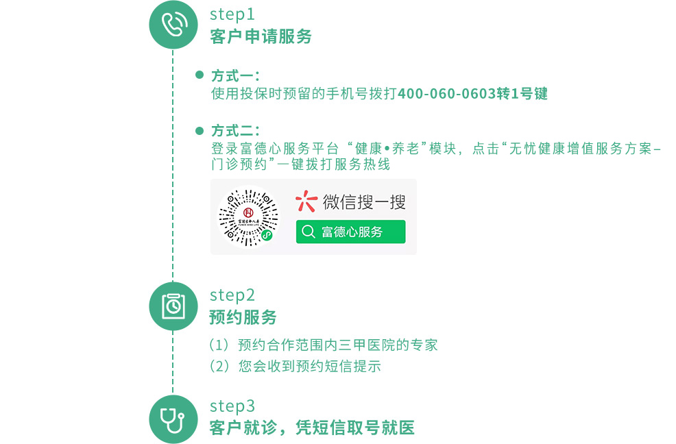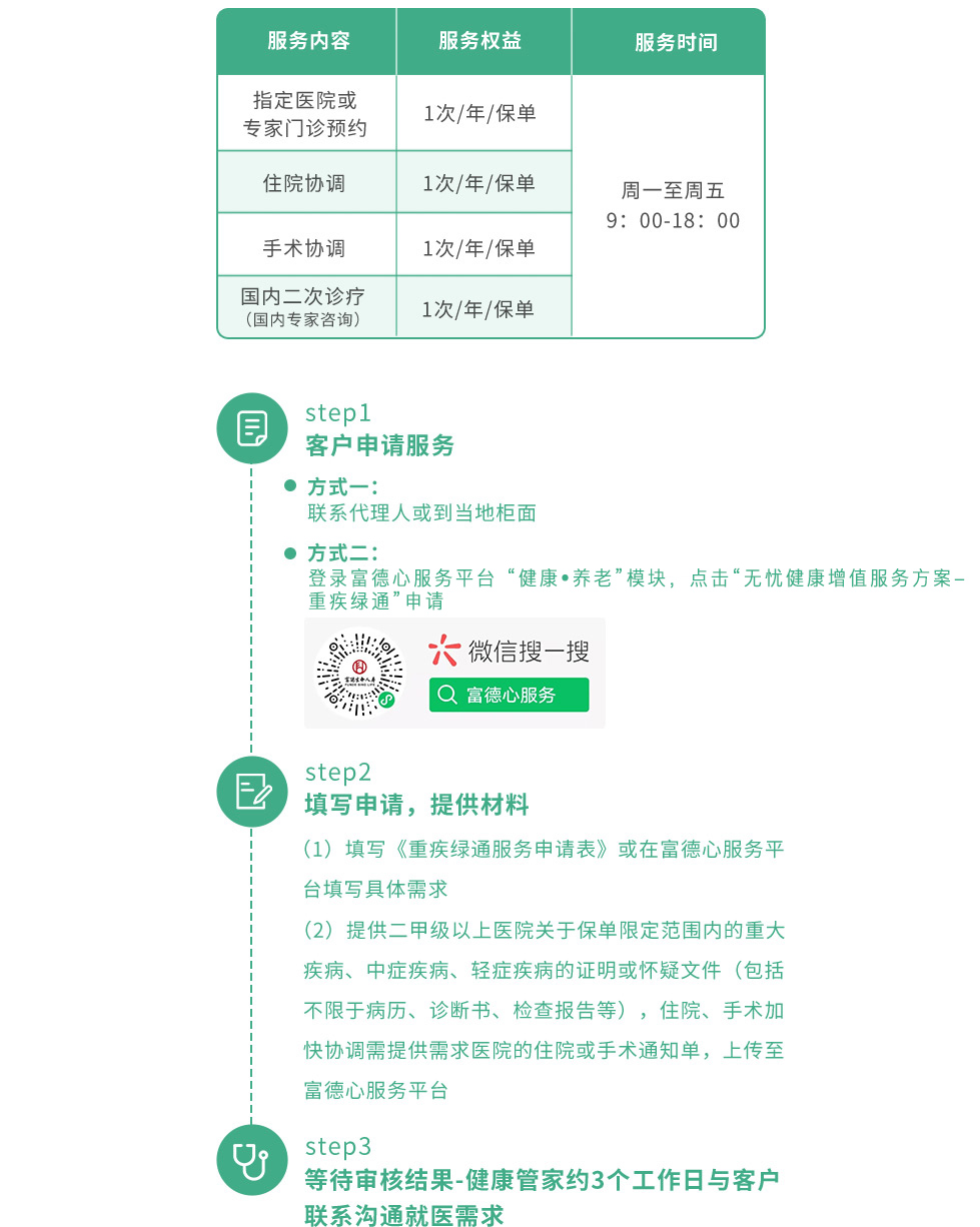 為符合一定服務(wù)條件的客戶提供集電話醫(yī)生、門診預約、住院協(xié)調(diào)、手術(shù)協(xié)調(diào)、國內(nèi)專家咨詢五項就醫(yī)服務(wù),其中指定醫(yī)院及專家門診預約、住院協(xié)調(diào)、手術(shù)協(xié)調(diào)、國內(nèi)專家咨詢四項服務(wù)為重疾綠通服務(wù)。有效保單客戶可在服務(wù)權(quán)益及期限內(nèi)免費使用,專屬綠通服務(wù),幫助客戶解決就醫(yī)后顧之優(yōu)。